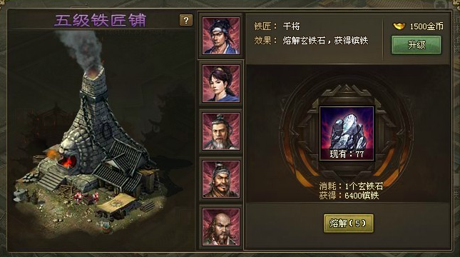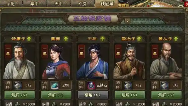 铁匠铺建造好了,你可别以为它就只是个小作坊,它的功能可是等级提升一步步解锁的,而且贼有用。一级铁匠铺主要功能是熔炼,可以把你在世界地图上占领铁矿获得的玄铁石溶解掉,变成升级兵器必需的镔铁。每天这个熔炼次数是有限制的,所以你得记得每天都来弄一下。等你把铁匠铺升到更高等级,比如二级就能熔炼那些宝物,三级可以处理不用的三星紫色装备,四级能熔炼更高级的玄铁原石,五级甚至能用银币来换镔铁。尤其是到了游戏后期,开启了神兵系统之后,铁匠铺更是产出百炼钢这种高级材料的主要来源,所以早点把它搞起来,并且优先升级,绝对是稳赚不赔的投资。