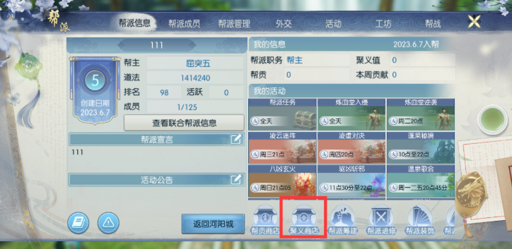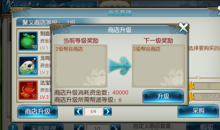 帮派聚义商店位于帮派属地坐标(133,74)处,也可通过帮派活动界面直接打开。商店等级与帮派等级挂钩,1级升2级需消耗30000帮派资金且帮派达到5级,后续每级升级消耗资金递增。商店分为系统自动刷新道具和帮派管理采购的自选商品两类,前者每周随机上架限购物品,后者需管理人员消耗帮派资金上架特定道具供成员购买。部分高阶道具如新法宝云中戏、二代宠物觉醒书等需大量聚义点兑换。