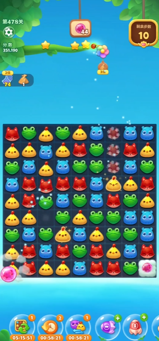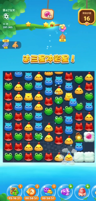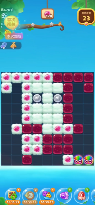 478关的核心任务是在22步之内解救被冰块困住的6只企鹅,这些企鹅分布在关卡四个角落各1只以及中间区域2只。关卡布局的最大难点在于冰块均为多层结构,且集中在四个边角位置,形成天然障碍阻碍消除操作。成功的关键在于高效利用有限的步数破除冰块并触发企鹅解救机制,过程中没有任何移动木桩、毒液等额外障碍干扰,玩家可专注于冰块消除策略。