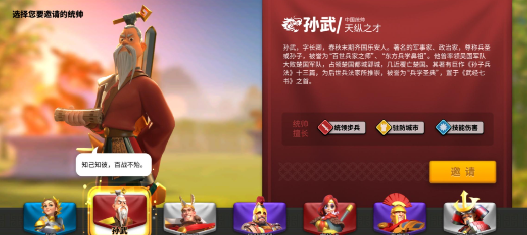 孙武作为步兵统帅,技能设计攻守兼备,觉醒后效果大幅提升,能在资源争夺和联盟战中占据优势。其主动技能对多目标造成高额伤害,被动技能降低所受伤害并增强步兵生存能力,前期实用性远超其他紫色武将, 。若玩家偏好骑兵流派,贝利撒留或拜巴尔可作为备选,但需搭配防御型副将弥补脆皮弱点, 。武将培养需长期规划,优先集中资源确保孙武技能升满,避免盲目投资橙色武将,因其觉醒成本高昂且周期较长, 。远征商店的埃塞尔弗莱德是平民获取金头的重要途径,可作为次要培养目标。