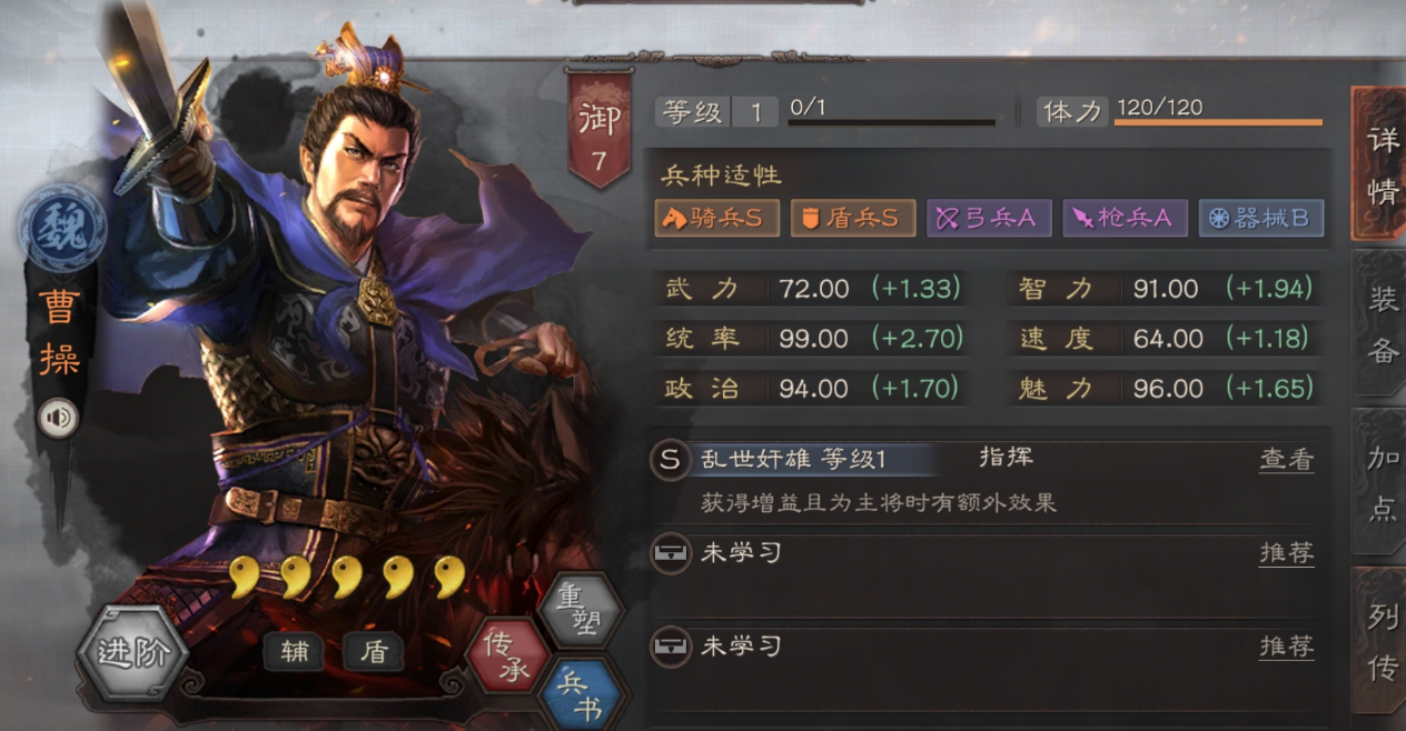 首先最实就是属性上的大提升,典藏版的曹操比起普通版能额外获得整整10点自由属性点,这相当于比别人多了一次关键的进阶效果,咱们可以自由把这10点加在统率或者智力上,让他在战场上更能扛更能打,无论是作为主将提供强力辅助,还是副将分担伤害都更稳了。而且他的基础属性和成长值本身就比普通曹操高一截,综合实力自然更突出,尤其是统率和智力这两项核心属性,加点后效果更显著。这种属性优势在高端局对抗满红队伍时,可能就是决定胜负的关键一点点了。
