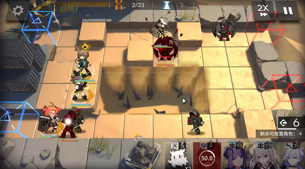 关键操作在于处理敌方术师单位:当首个术师移动至特定位置时,立即部署工具人干员朝右将其推开,创造输出窗口。随后在左侧区域补充群攻术师增强火力覆盖。中期阶段需及时将先锋干员替换为重装干员,尤其在敌方高阶术师出现时,利用重装单位吸引火力为输出争取时间。阿消的技能释放时机需精确把控,通常在敌人聚集或接近危险区域时启动推力效果。