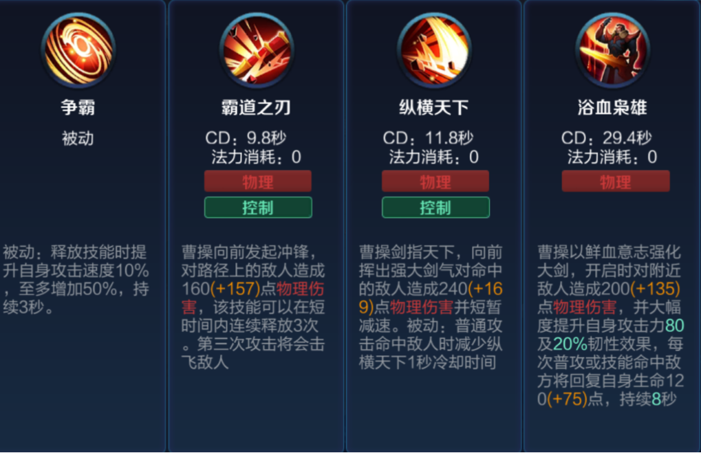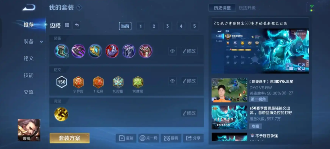 被动叠满五层攻速加成很高,平时可以空A保持层数不断,打架时伤害更足。二技能命中后普攻能减它的冷却,所以连招里记得多A一下,比如A2A就很流畅。召唤师技能带终结或者惩戒都行,终结补伤害收人头,惩戒走打野位发育更快。逆风局曹老板单挑能力强,可以多带线牵制,有人来抓得少能打,来得多队友就有机会推塔偷龙。对线发育为主,四级后积极游走带节奏。团战看准时机切后排,大招开启的时机决定成败。