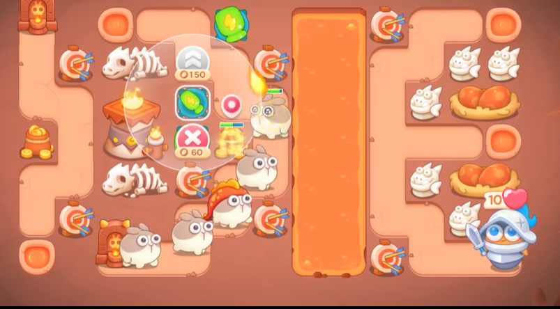 最后一波攻击到来前要确保所有炮塔布局达到最佳状态,左侧以喷火器为主力输出,中间岩浆中获得的乒乓球炮塔作为辅助,右侧则依靠导弹炮塔进行防空和补漏。整场战斗要始终保持对飞行兔子的高度警惕,及时发现并补充对空炮塔。同时也要留意那些带有护盾的兔子,击破护盾后它们移动速度会加快,需要立即锁定清除。道具清理方面要善用保龄球的穿透能力和回旋镖的反弹特性,逐步开拓地图扩大防御纵深。