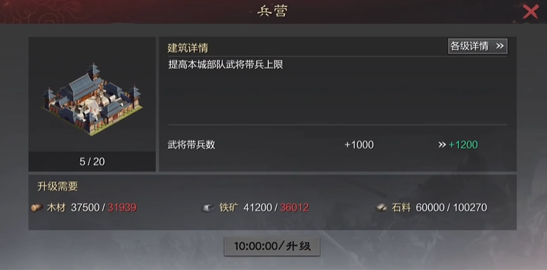 提升征兵效率的关键在于建筑升级和策略运用。主城中的兵营、校场和募兵所是影响征兵的核心建筑,校场升至3级和5级时可额外增加征兵队列,募兵所等级提升能显著缩短征兵时间。预备兵营可以储存之前征兵留下的储备兵员,在急需兵力时能快速调用而无需等待。新手阶段应优先升级这些军事建筑,同时注意城池等级越高,可征募的兵种越先进,征兵速度和数量也会相应提升。合理规划建筑升级顺序,将资源优先投入到关键设施的建设中。