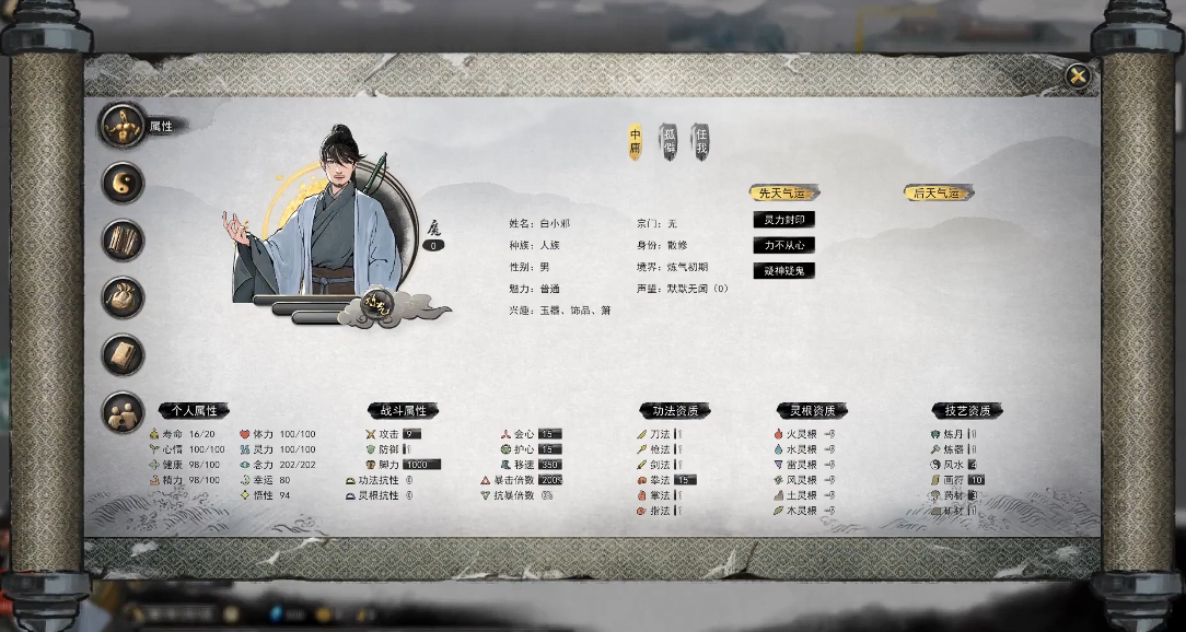 在刷取先天气运时,建议优先考虑那些增加悟性和幸运值的气运。悟性影响学习技能的速度和效果,幸运值则关系到各种随机事件的触发概率,这两个属性在游戏中很难通过其他方式提升。相比之下,功法和灵根资质可以通过后期服用丹药来提升,所以不必过于追求这些方面的初始加成。
