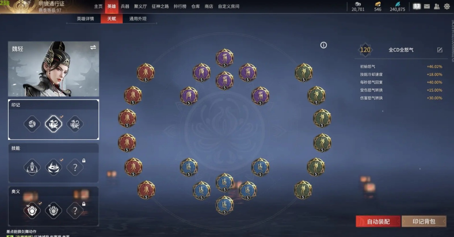 这取决于你的英雄和打法,但有一些通用性很强的选择。红色本源印记中,易怒和体能是很多英雄的优先选择,它们分别影响怒气恢复和精力恢复,对战斗的持续性和大招频率至关重要。紫色极阴印记里的灵巧减少闪避消耗,暴怒和反噬增加怒气获取,也都很实用。绿色万物印记的顽石直接增加精力上限,让你能做出更多连续操作。蓝色极阳印记的神索增加钩锁距离,极速减少技能冷却,都能显著提升机动性和技能释放节奏。你可以根据自己常用英雄的特性,先集中古币把这些核心印记升起来。