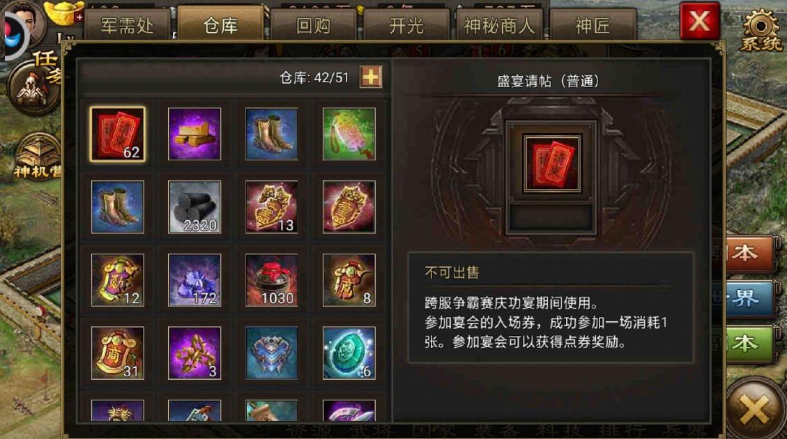 牢房与术士工坊的升级是后期点券的关键消耗项,牢房一级可用银币开启,二级至五级必须用点券购买图纸升级,等级提升后可关押更多武将,获取大量镔铁、经验等稀缺资源,支撑兵器与武将培养。术士工坊优先升至三级,借兵上限可达60,国战中能快速补充兵力,抢占城池优势,后续再逐步提升等级,借兵数量与质量同步提升,成为国战续航的重要保障。这两类建筑升级性价比极高,能稳定提升资源获取与实战能力,是后期必点的点券投入方向。
