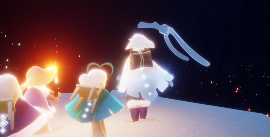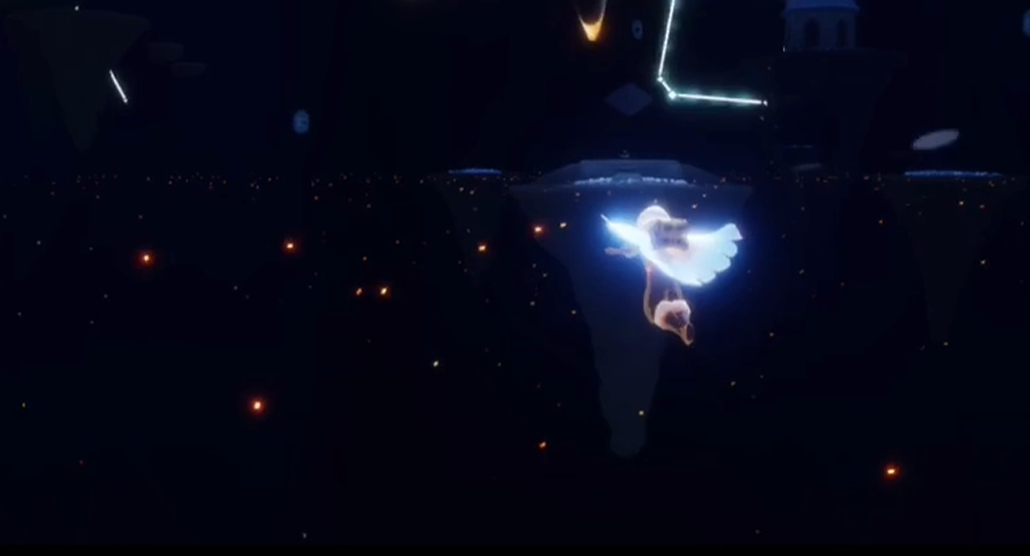 到达三楼后别急着上楼,先找到中间圆锥形平台,那里有一堆鱼骨头就是目标位置之一。不过这里光线比较暗,建议把游戏亮度调高些。激活鱼骨头附近的蜡烛后,就能解锁鲲叫先祖。接着往对面看会发现另一个发光小岛,飞过去对着祈祷石做动作直到石头全变白,就能解锁漂浮打坐先祖。