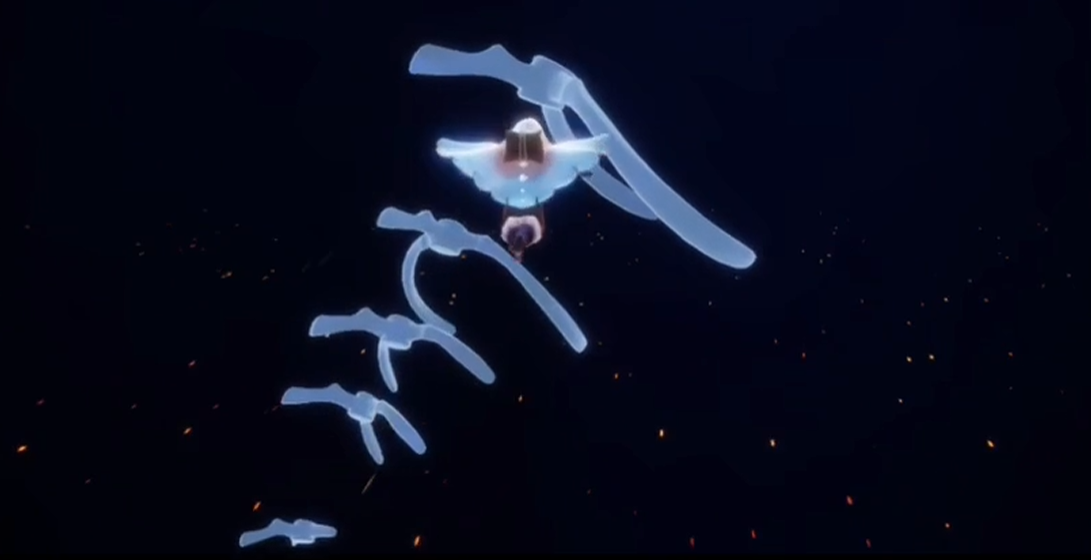 楼梯附近能找到骨鲲先祖,而亭子斜上方藏着椅子先祖。这里最特别的是一段很长的生物骨架,最大的骨头上藏着光之翼,但由于周围环境昏暗,要飞近才能看清楚。记得多调整视角观察,有时候转个方向就能发现隐藏路径。