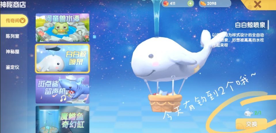 钓到白鲸后,咱们就可以去找NPC大力兑换家具了。大力通常在游乐场门口或者爱心广场附近,打开地图就能找到他。和他对话选择商会信息,然后在传奇阁里找到白白鲸喷泉进行兑换。这个喷泉超级可爱,摆在家里特别有排面。记得背包里要带着白鲸才能兑换,千万别把它放在仓库里啦。