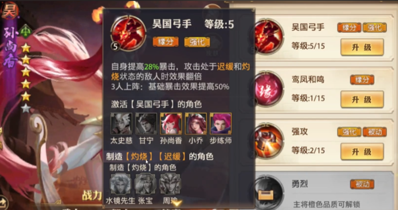 吴弓阵容的核心思路是利用吴国弓手的高暴击和远程输出优势,配合军师周瑜的灼烧效果打出爆炸伤害。这套阵容对平民玩家比较友好,主要武将包括孙尚香、甘宁、小乔、太史慈等,前排则需要黄盖、周泰这类盾兵吸收伤害。关键思路是让弓手在后排安全输出,同时通过迟缓、灼烧等状态提升暴击率,快速消灭敌方单位。