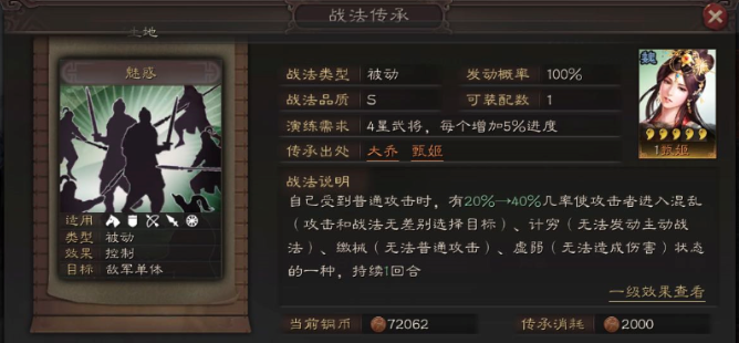 孙坚一开自带战法,对面就得盯着他打,挨普攻的次数蹭蹭涨。魅惑正好是在挨普攻时有几率给打你的人随机上点负面状态,比如缴械、计穷、混乱或者虚弱。想想看,对面正猛攻孙坚呢,突然来个缴械没法普攻了,或者混乱了打自己人,这不就帮团队减轻压力了嘛。这种联动让孙坚从一个纯挨打的肉盾,变成了能搅乱对手节奏的控制点,队伍整体扛揍能力也跟着提升不少。不过得提醒下,魅惑是概率触发,不是百发百中,但触发频率在嘲讽加持下还是有很大保障的。