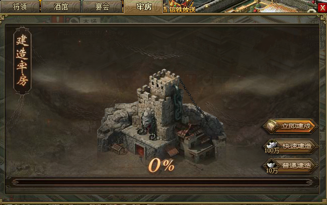 牢房本身需要你先达到八十一级,并且成功击败于禁后才能解锁,在点券商城里购买一级牢房图纸后就可以开始建造了,牢房等级的提升会逐步开放更多高级功能,其中就包括了与造城相关的运河开凿,每次抓捕到敌国武将后,除了常规的鞭挞获得经验外现在还能选择让他们去进行劳作,这种劳作的效率会牢房等级的提高而增加,所以尽早把牢房等级升上去是非常划算的投资。