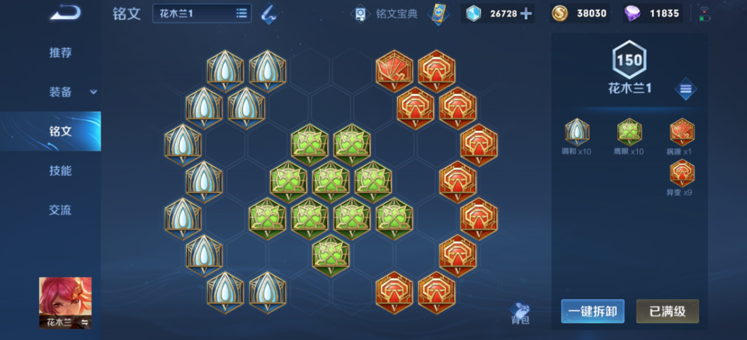 花木兰通常选择以物理穿透为主的组合。红色铭文优选异变来提升物理攻击和穿透,绿色铭文鹰眼进一步增加物理穿透形成百穿效果。蓝色铭文可以选择隐匿来增加物理攻击和移速,或者搭配少量调和铭文来增强前期的续航能力。这样的铭文配置能让花木兰在游戏前期就具备可观的威胁性,配合正确的技能连招可以快速建立线上优势。