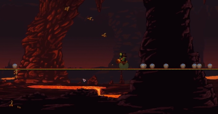 活跃着的敌怪也很多,而且都挺难缠。你会遇到飞来飞去的地狱蝙蝠和熔岩蝙蝠,还有会发射火球的远程火焰小鬼。恶魔、大恶魔和巫毒恶魔也会在这游荡,击杀巫毒恶魔有几率掉一个叫向导巫毒娃娃的东西,这玩意可千万拿好别掉岩浆里了。这里还有很长的骨蛇,它会穿墙攻击你。这些怪物大多会飞,攻击还常常附带点燃效果,让你持续掉血,掉进岩浆池更是会瞬间受到巨大伤害。
