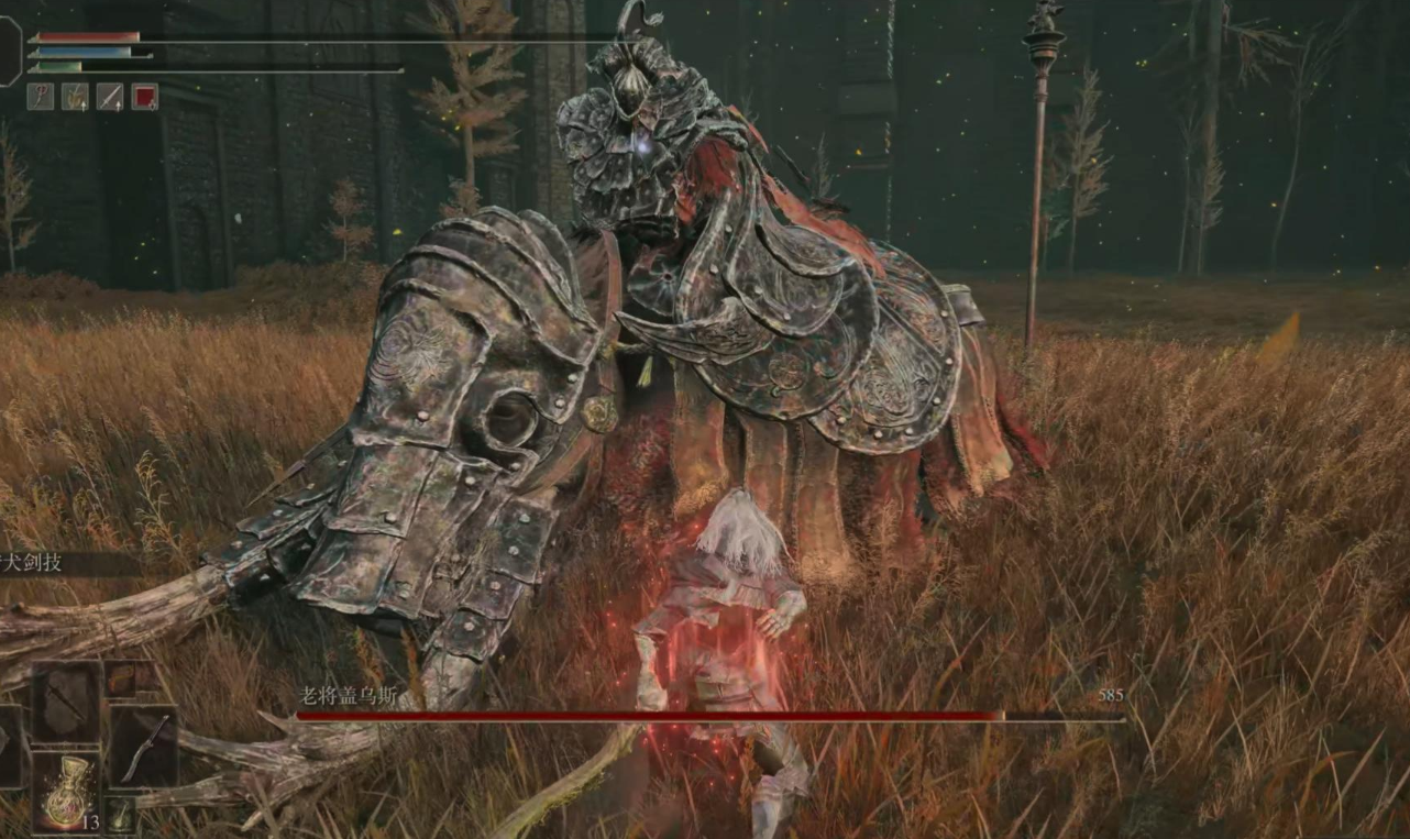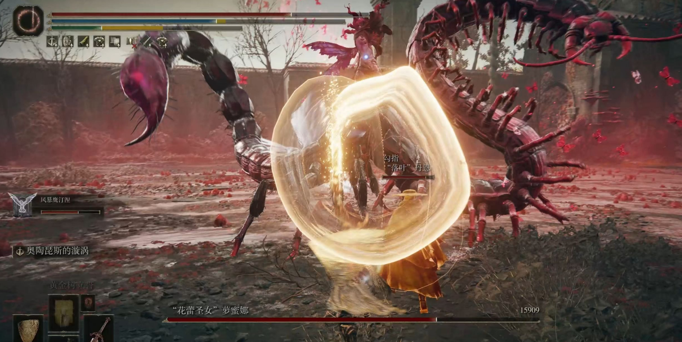 战斗策略需注重节奏控制,利用跳劈和战技狮子斩制造高削韧攻击,打断敌人动作。面对群体敌人时,可切换旋风斩战技实现范围压制。祷告辅助技能如黄金树立誓(提升攻防)和黑焰庇佑(减伤)可进一步增强生存能力,但需注意后者会降低治疗效率。蓝量分配以支持3-4次战技释放为基准,专注值建议维持在20-30点。